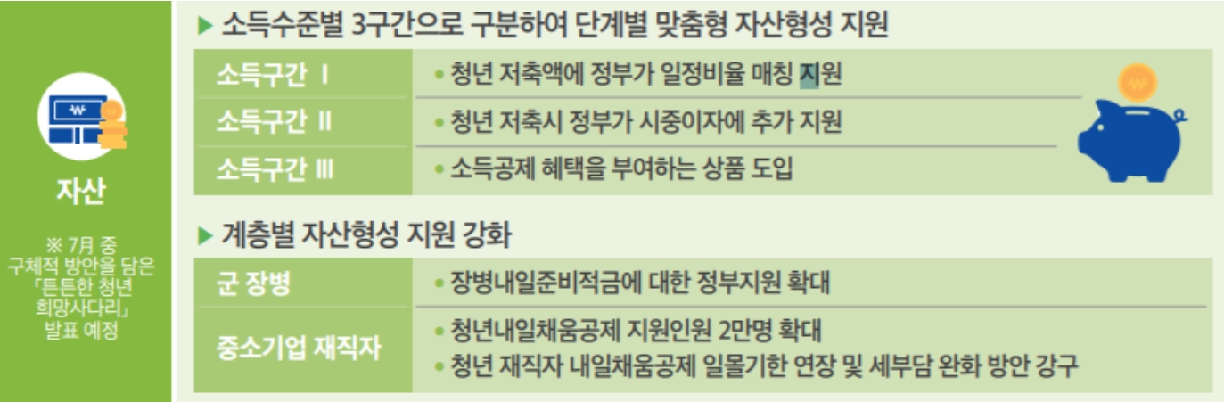 청년 내일 저축계좌는 최저임금 이하의 근로, 사업 소득을 가진 자를 대상으로 저소득 청년이 매달 10만 원을 저축하면 정부가 10만 원을 추가 지원하는 등의 방식이다. 3년간 720만 원의 목돈 마련을 돕는 청년 내일 저축계좌(가칭)를 오는 7월 청년대책으로 발표할 예정이다. 정부는 하반기로부터 청년 소득 수준에 따라 세구 간으로 구분해 구간별 맞춤형 자산 형성을 지원하기로 했다.