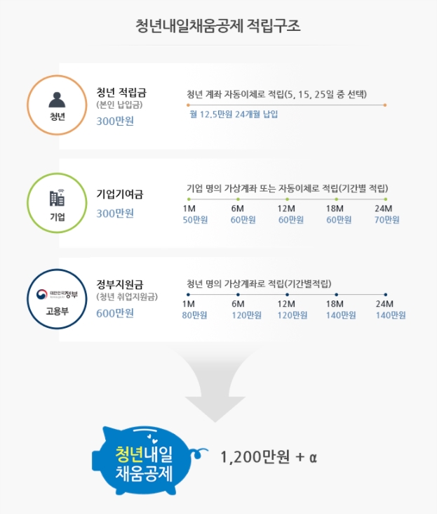 본인이 300만 원을 24개월 동안 매달 12만 5천 원씩 납입을 하게 되면 기업에서 기여금을 본인이 납입한 만큼의 금액을 더해주고 또 정부지원금으로 기업과 본인의 적립, 기여금을 더해 2년 후 만기 시에 900만 원이 더해진 총 1200만 원 원금을 받을 수 있습니다. 개인은 최소 2년 동일 사업장에서 근무하면서 실질적 경력 형성의 기회를 가질 수 있습니다. 만기 후 중소벤처기업부의 내일 채움 공제(3~5년)로 연장 가입 시 최대 8년의 장기적인 목돈마련이 가능합니다. 기업은 2년간 채용유지 지원금 300만 원을 지원받을 수 있고 인재육성형 전용자금 지원대상으로 편입 등 중소벤처기업부 사업 참여 시 혜택을 받을 수 있습니다. 잦은 이직으로 인해 인력난이 심각한 중소기업은 우수인력을 고용유지할 수 있는 기회가 됩니다. 최대 8년까지 연장이 가능하고 목돈을 마련하여 결혼 준비자금으로도 사용할 수 있고 내 집 마련의 기회도 준비할 수 있습니다.