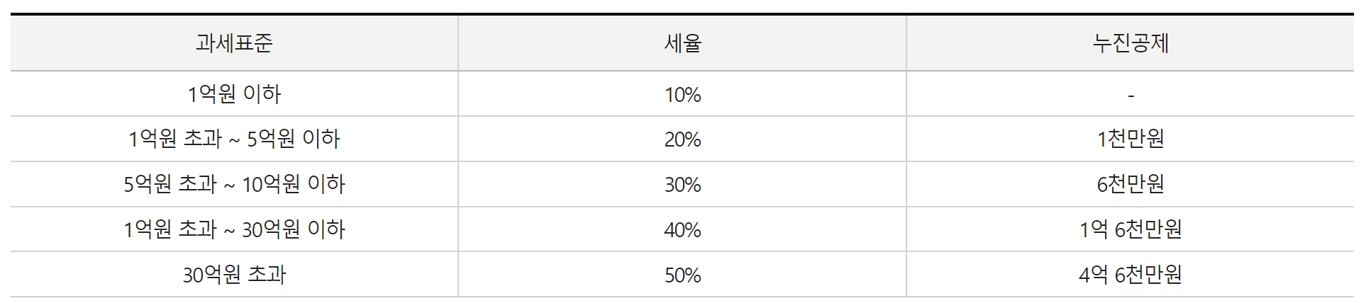 수증자가 거주가, 비거주자이면서 기본세율 적용 증여재산일 경우에는 1억 원 이하일 땐 세율 10%,5억 원 이하일 땐 세율 20%에 누진공제액 1천만 원, 10억 원 이하일 땐 세율 30%에 누진공제액 6천만 원, 30억 원 이하일 땐 세율 40%에 누진공제액 1억 6천만 원, 30억 초과일 땐 세율 50%에 누진공제액 4억 6천만 원까지 부과합니다. 수증자가 거주자이고 특례세율 적용 증여재산일 경우에 해당(해당 창업자금, 가업승계 주식 등)하는 경우에는 창업자금은 10% 세율이며, 가업승계 주식 등은 10% 세율이며 과세표준 30억 원이며 초과분은 20%를 적용합니다.