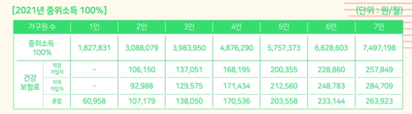 - 기준 중위소득 100% 이하 : 1인 1,827,831원, 2인 가구 3,088,079원, 3인 가구 3,983.950원, 4인 가구 4,876,290원, 5인 가구 5,757,373원입니다.