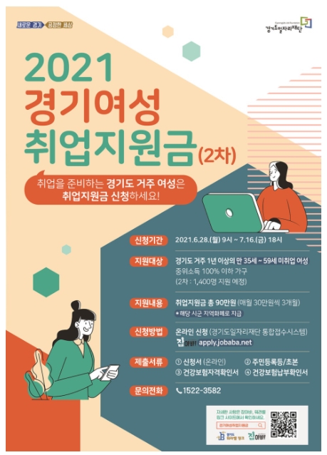 도는 이번 2차 사업을 통해 도내 경력단절 여성 등 1천400명을 대상으로 '경기여성 취업지원금' 월 30만 원씩 최대 3개월 간 최대 90만 원씩을 지급합니다