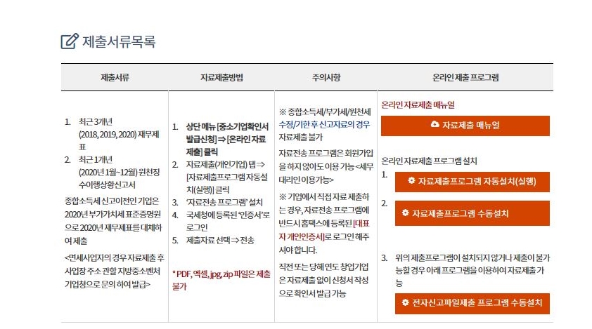 현재 중소기업 확인서는 온라인과 오프라인 모두 신청이 가능합니다. 중소기업 확인서 발급절차는 온라인과 오프라인에 따라 약간 상이합니다. 온라인 신청은 온라인 제출 프로그램에서 회원가입이 안되어 있는 경우 회원가입 후 단계별로 작성하여 해당 자료를 제출해야 합니다. 온라인 제출자료는 제출 프로그램을 통해 국세청에 신고한 자료를 제출하여야 하고 온라인으로 제출한 자료를 항목별로 조회 가능합니다. 자료 제출 완료 후 신청서를 작성하고 오류 발생 시 오류 발생 사항을 확인하여 확인서 출력 및 수정이 가능합니다. 개인기업 자료제출서류 시 유의사항은 최근 3개년 중 3년 이하 간편 장부 대상 기업에 해당하는 경우 해당 연도 부가세 신고자료(재무제표나 부가세 과세표준 증명원)로 제출 후에 사업장 주소 관할 지방 중소 벤처 기업청 담당자에게 문의하면 됩니다. 법인 기업 자료 제출 유의사항으로는 직전 년 결산 신고 이후 정기 신고의 경우에는 해당 연도는 신고 익일부터 자료 제출 프로그램을 통해 제출이 가능하며 신고 당일의 경우 회계 프로그램으로 직전 년(2020년) 법인세 전자신고 파일로 제출할 수 있습니다.