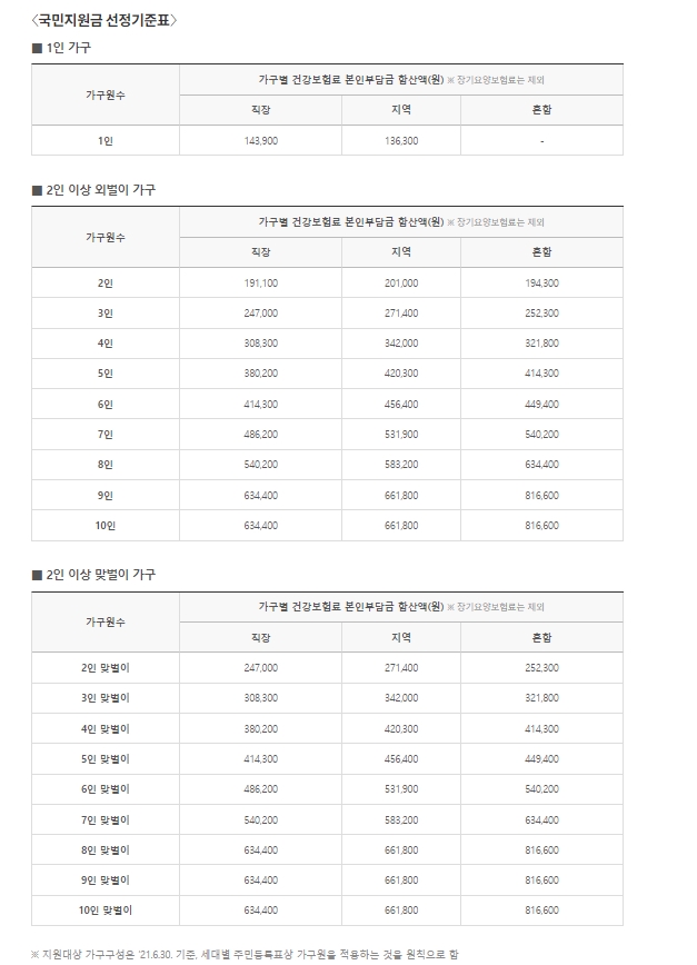 1인 가구 연소득 5천만 원 이하여야 하고 5차 재난지원금 대상 1인 가구 선정기준은 건강보험료 본인부담금 합산액을 보자면 직장 기준으로 143,900원, 지역가입자는 136,300원입니다. 이 기준 금액 이하는 되어야 합니다. 단 장기요양보험료는 제외된 금액입니다. 소득 하위 88% 기준 건강보험료를 산정했을 때는 1인만 추가하면 되기 때문에 3인 가구 맞벌이 1억 532만 원 3인 가구 홀벌이 8천605만 원 4인 가구 외벌이 1억 532만 원 이하 4인 맞벌이 1억 2436만 원 연소득 이하라면 누구나 대상이 될 수 있다는 것입니다. 세전 금액으로 계산해보면 1인 가구 4,021,228원, 2인 가구 6,793,774원, 3인 가구 8,764,690원, 4인 가구 10,727,938원, 5인 가구 12,666,221원 6인 가구 14,582,927원 이하의 월급을 받는다면 5차 재난지원금 대상자로 선정될 수 있습니다.