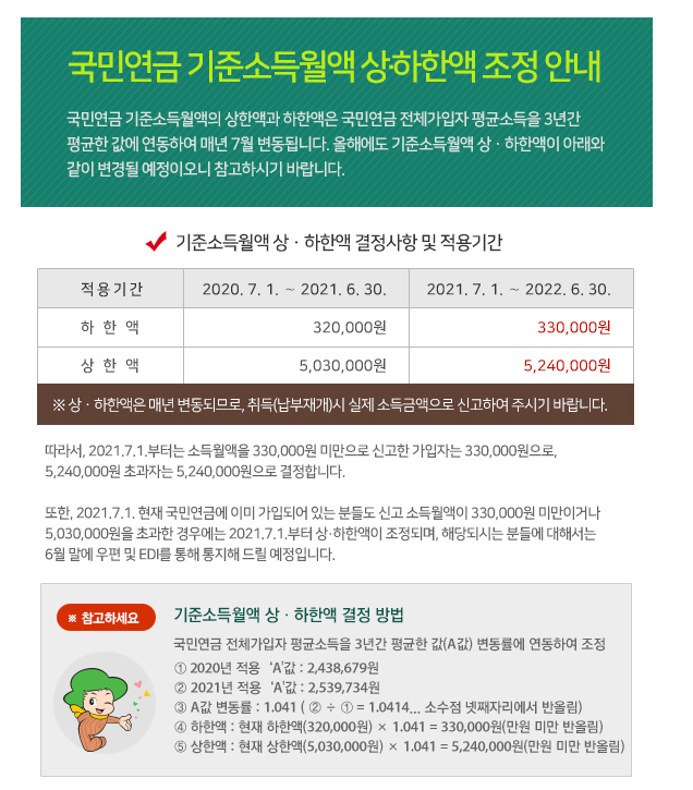 전체 가입자 평균 소득의 최근 3년간 평균액 변동률을 반영하여 국민연금을 인상하는 구조로 기준 소득월액 기준 소득월액 상하한 액 4.1% 상승되어 기준 소득월액 상한액이 524만 원이 된다.