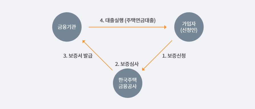 신청인이 공사를 방문하여 보증상담을 받고 보증신청을 합니다. 공사는 신청인의 자격요건과 담보주택의 가격평가 등에 대하여 심사를 진행하고 보증약정 체결과 저당권 설정의 과정을 거쳐 금융기관에 보증서를 발급합니다. 신청인이 금융기관에 방문하여 대출거래약정 체결 이후 금융기관에서 주택연금 대출을 실행합니다.