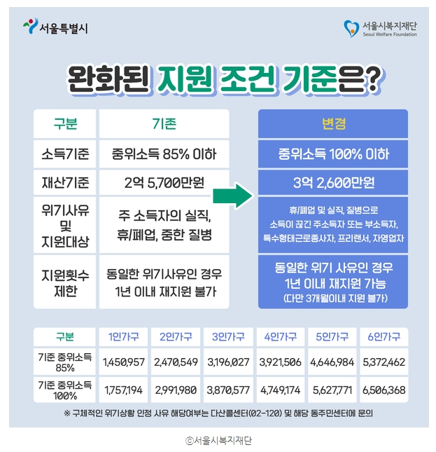소득기준은 기준 중위소득 85% 이하에서 기준 중위소득 100% 이하로 재산기준은 2억 5,700만 원에서 3억 2,600만 원 이하로 각각 완화되었고 폐업·실직 후 바로 지원 가능합니다. 지원대상은 옥탑방·고시원·쪽방촌 등 거주자, 고독사 위험가구, 저소득층 독거어르신, 폭염으로 인한 온열질환자 이외에 코로나 19에 따라 소득이 급격히 감소한 특수형태 근로종사자, 프리랜서, 자영업자인 주소득자 또는 부소득자도 긴급지원금을 받을 수 있도록 위기상황 고시안을 일부 개정하였습니다.