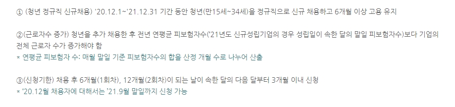 전년도 연평균(21년 고용보험 신규 성립 기업의 경우에는 설립일이 속한 달의 말일 ) 기준으로 청년(만 15세 이상 34세 이하)을 정규직으로 신규 채용한 5인 이상 중소·중견기업 사업주에게 지원하며 단 성장유망업종, 벤처기업 등은 5인 미만도 가능합니다. 지원제외대상으로는 시행·유흥업 등 일부 업종, 최저임금 미만&4대 보험 미가입자, 채용일 기준 주 소정근로시간이 30시간 미만인 근로자, 채용일 기준 고등학교 또는 대학 재학 중인 자는 지원이 불가하며 방송·통신·방송통신·사이버(원격대학), 학점은행제, 야간대학, 대학원 재학 중인 자는 지원이 가능합니다.