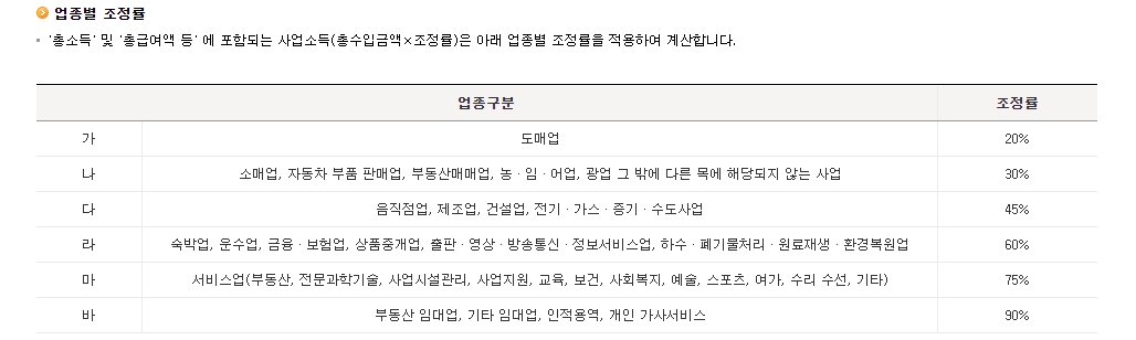 자녀장려금은 근로장려금과 달리 가구별로 제한이 없습니다. 홑벌이, 맞벌이는 4,000만 원입니다. 근로소득은 총급여액이며 기타 소득은 총수입금액에서 필요경비를 뺀 금액입니다. 종교인, 이자, 배당, 연금소득은 총수입금액에 해당됩니다. 사업소득은 총수입금액*업종별 조정률을 곱해야 합니다. 사업소득 업종별 조정률은 도매업은 20%이며, 농, 임어업, 광업은 30%, 제조업, 음식점업은 45%, 부동산 임대업은 90%입니다.