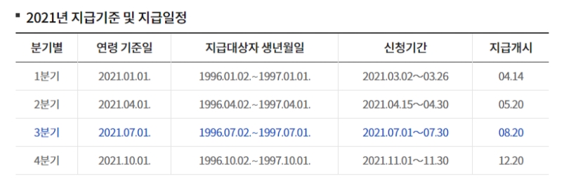 경기도 청년 기본소득 3분기 대상자는 96.07.02~97.07.01 년생까지이고 신청기간은 21.07.01~07.30일까지 진행되며 지급은 8월 20일부터 시작됩니다. 생년월일 해당하시는 분들은 신청기간 내에 신청하시기 바랍니다. 2021년 지급기준 및 지급일정은 다음과 같습니다.