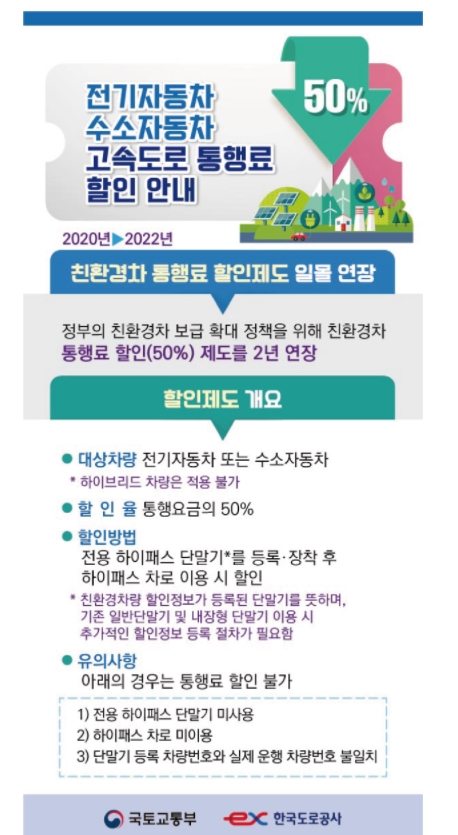 전기자동차 구입시 전기자동차 보급 확대 및 미세먼지 저감 등을 위해 2020년까지 였던 고속도로 톨비 할인을 2022년 12월까지 연장하기로 하였습니다. 무료 50% 할인이니 비용 부담이 반으로 줄어들 수 있습니다. 할인 방법은 전용 하이패스 단말기를 등록 장착 후 하이패스 차로 이용 시 할인되고 친환경차량 할인정보가 등록된 단말기를 뜻하며 기존 일반 단말기 및 내장형 단말기 이용 시 추가적인 할인정보 등록 절차가 필요합니다. 전용 하이패스 단말기를 미사용 하거나 하이패스 차로 미이용, 단말기 등록 차량번호와 실제 운행 차량번호가 불일치할 경우 할인이 불가합니다.