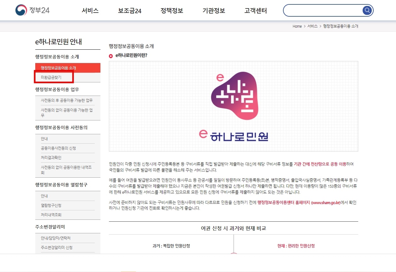 정부 24 홈페이지> 서비스> e하나로 민원> 미환급금 찾기 화면에서 [미환급금 찬기] 버튼 선택
