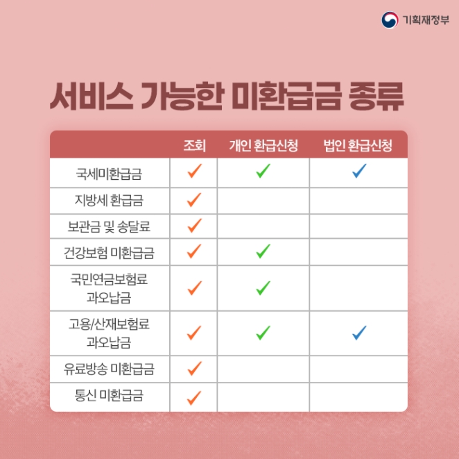 조회: 국세 미환급금, 지방세 미환급금, 보관 및 송달료, 건강보험 미환급금, 국민연금보험료 과오납금, 고용 산재 보험료 과오납금, 유료방송 미환급금, 통신 미환급금