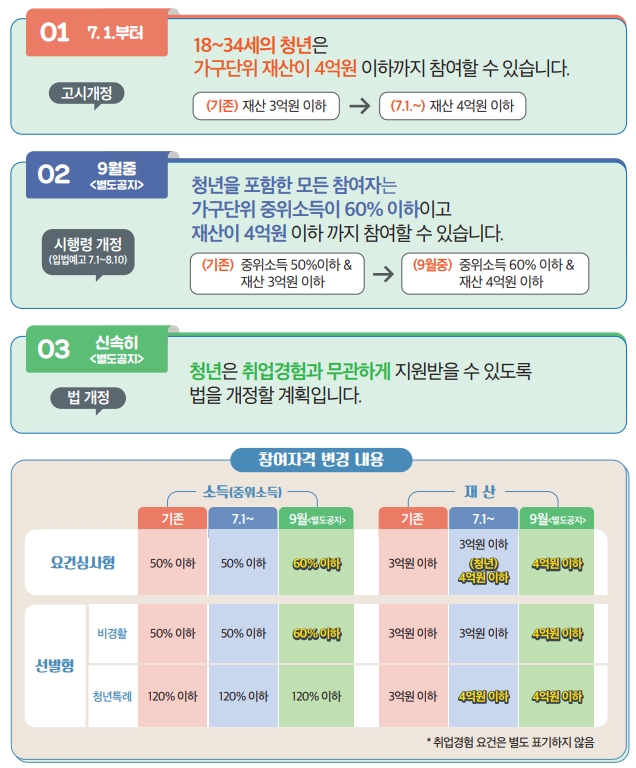 기존 국민 취업지원제도 1 유형의 경우, 3억 원 이하의 재산만 허용되었으나 청년의 경우는 4억 원 이하로 참여자격이 변경됩니다. 또한 7월, 9월 단계 순으로 자격이 확대되는데 확대된 국민 취업지원제도 1 유형은 표를 잘 참고해보시길 바랍니다.