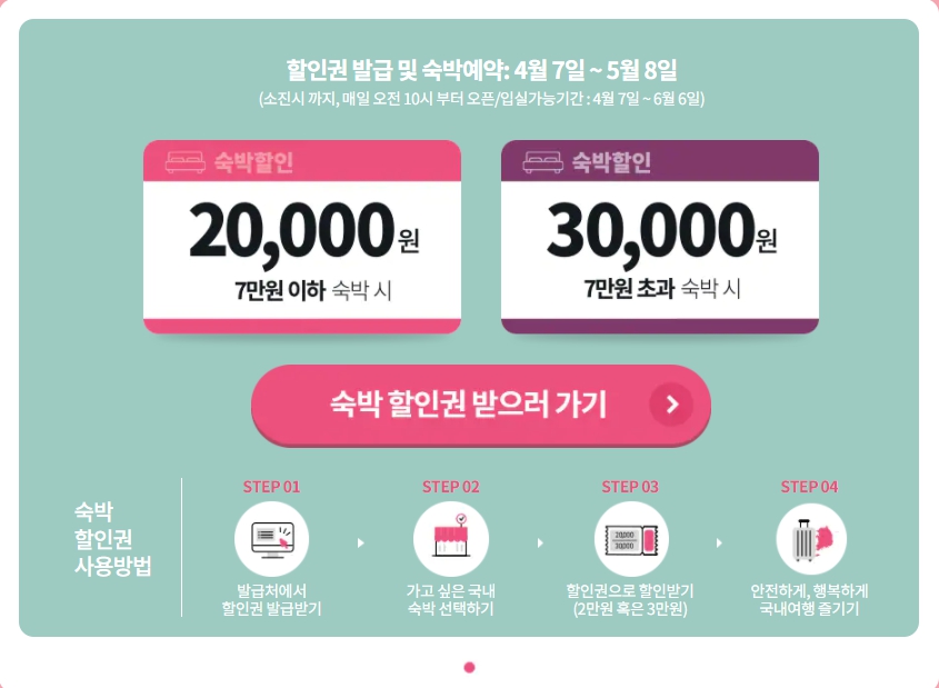 발급기간은 4월 7일부터 5월 8일까지 매일 오전 10시부터 오픈되고 입실 가능 기간은 4월 7일부터 6월 6일까지 입니다. 그 이후에 여행을 계획하고 있다고 해도 숙박 대전 쿠폰 혜택을 받을 수 없으니 참고하시기 바랍니다.